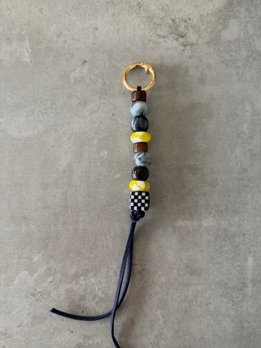 bag/key charm mixed - brown, greys, yellow and pattern.